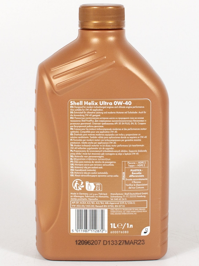 Shell Helix Ultra 0W-40 - Полностью синтетическое моторное масло для самых современных двигателей, созданное на основе уникальной технологии Shell PurePlus. Обеспечивает исключительную защиту и очищение даже при самых долгих рекомендованных автопроизводителями интервалах замены масла. Позволяет сохранить чистоту двигателя на уровне заводского конвейера. Защищает турбированные двигатели с непосредственным впрыском бензина от преждевременного самовоспламенения топливно-воздушной смеси (эффекта LSPI).